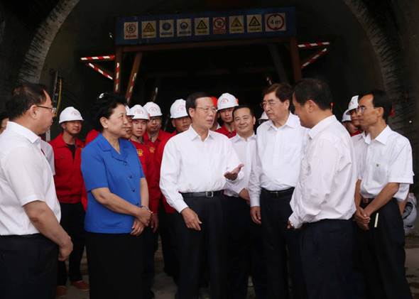 張高麗在京張鐵路八達嶺長城站施工現場,察看隧道工程進展情況,中鐵咨詢總經理李壽兵陪同。(圖片來自新華社)