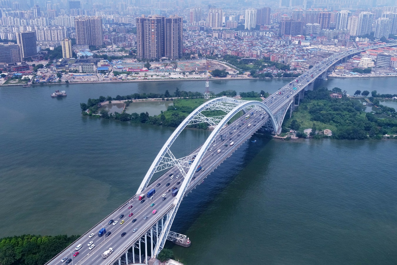 廣州市丫髻沙大橋,位于廣州市主城區西南部,跨越珠江主、副航道和丫髻沙島,全長1084米。主橋采用(76+360+76)米三跨連續自錨式鋼管混凝土拱橋,跨越副航道采用(86+160+86)米三跨連續預應力混凝土剛構橋,全橋橫向布置雙向六車道,2000年6月建成。